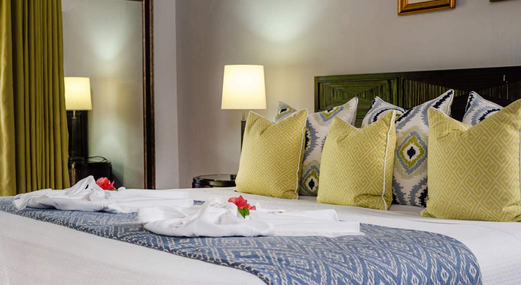 All rooms have private shower, ceiling fans, hair dryers, fridge (stocked daily with soft drinks, beer, sparkling and still water), multi-speed direct dial telephone, tea and coffee making facilities, in room safe and terrace. All rooms offer a large king size bed.