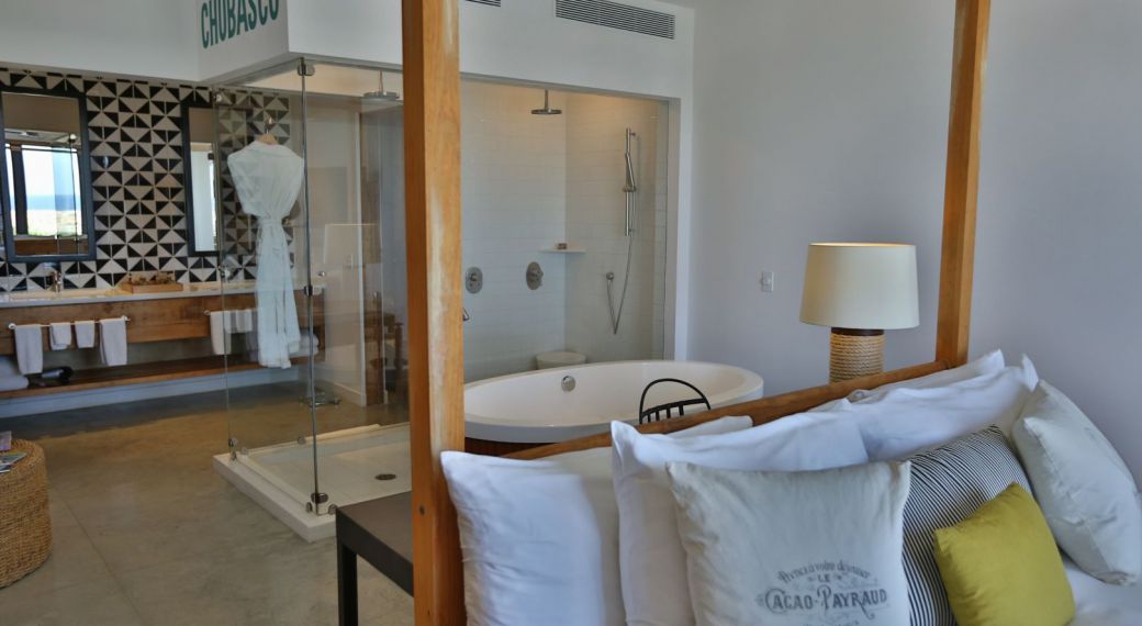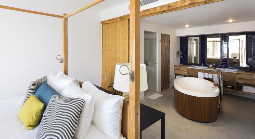 Master Suite featuring sweeping ocean views, balcony, and rustic wooden furnishings, spacious and full of light. There’s a plush king-size canopy bed a separate living room, and a glossy white-tiled bathroom with a separate bathtub, and rosemary bath products.